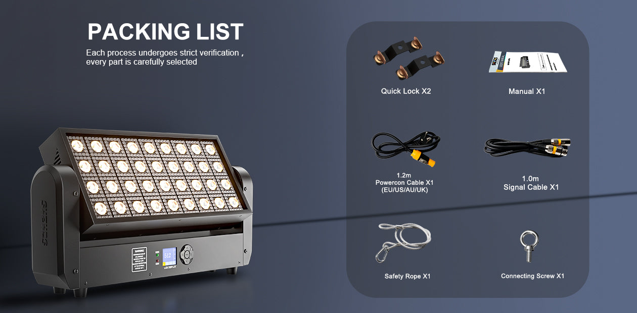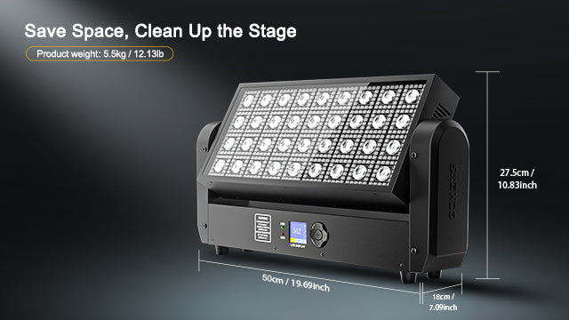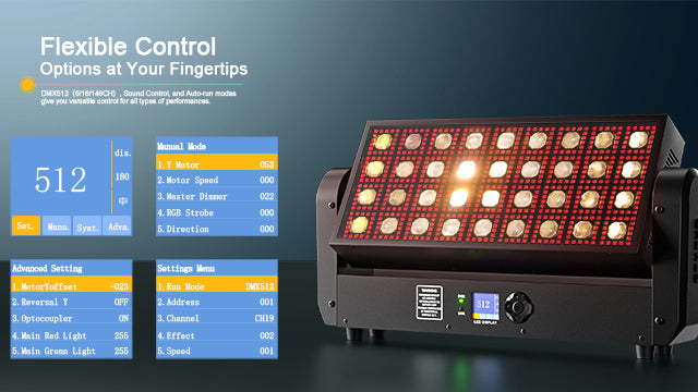 DMX512(6/16/146CH), Sound Control, and Auto-run modes give you versatile control for all types of performances.
