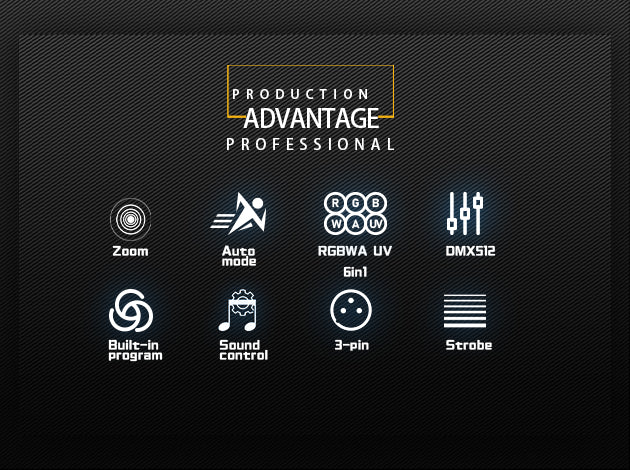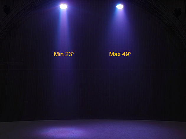 A linear focusing system with a beam angle of 24 ~49 °, multiple speed strobe effects,and a smooth dimming function of 0-100%,